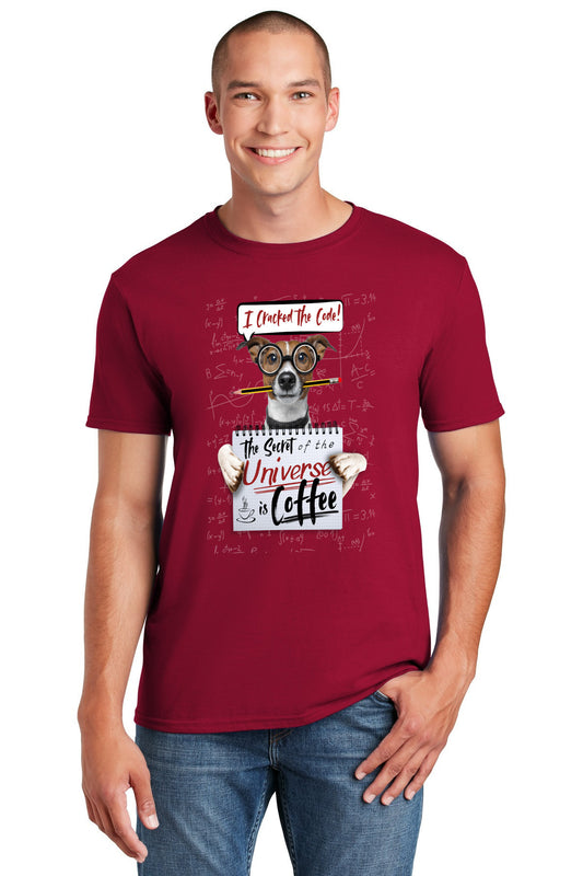 I Cracked The Code: Secret Of The Universe is Coffee - Funny T-Shirt with cute dog wearing glasses