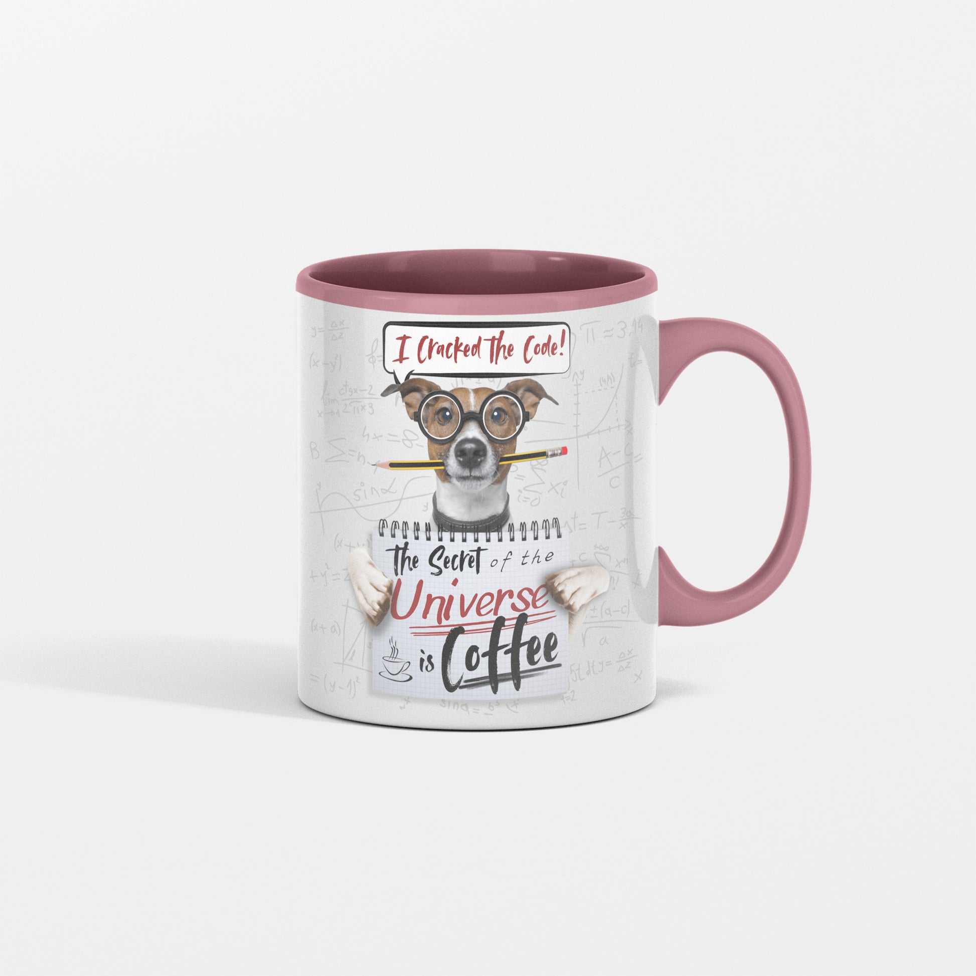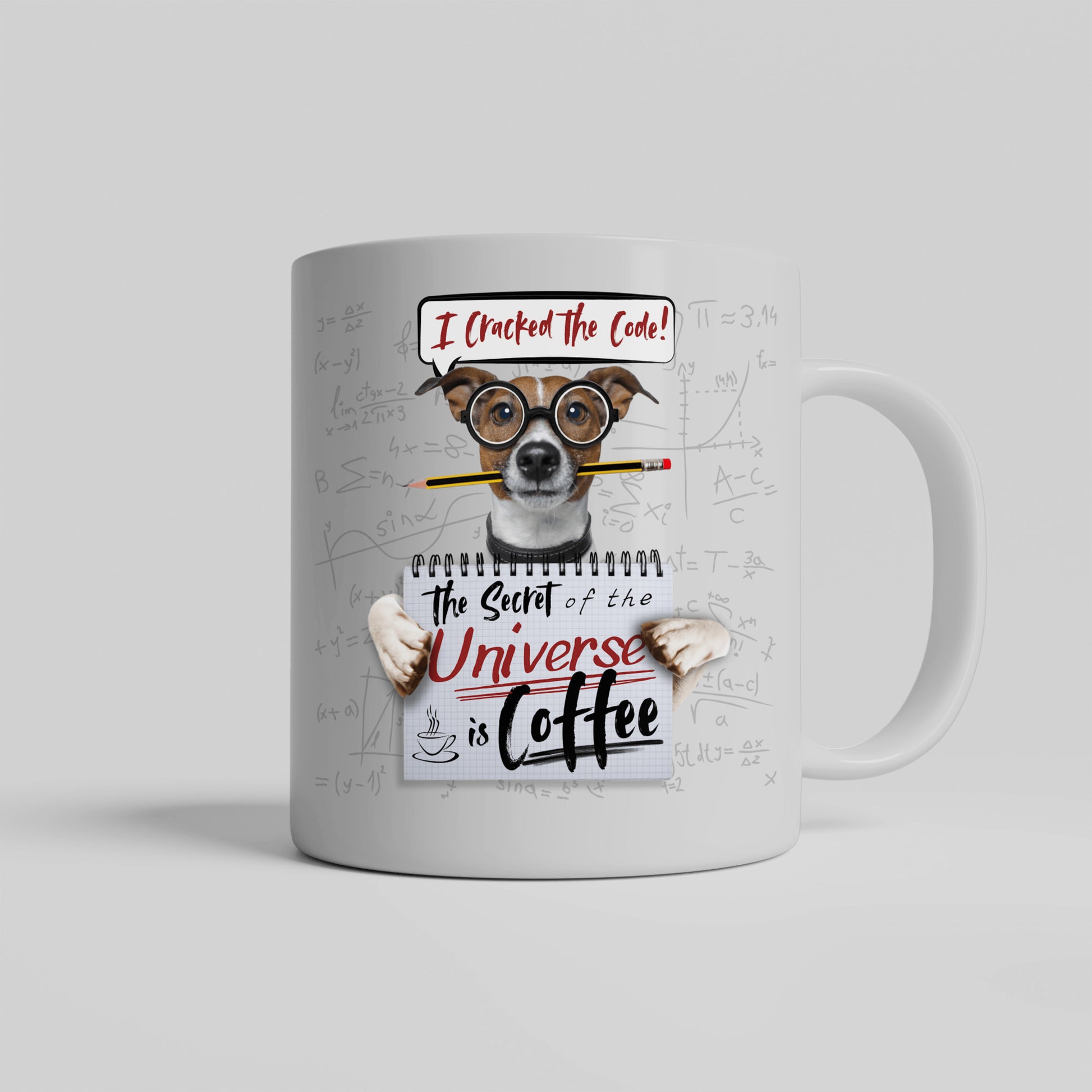 Discover the ultimate truth as discovered by the smartest dog in the world: coffee is the key to cracking the code of the universe! Sip your morning brew in style with this funny mug featuring a cute dog donning glasses, a pencil and notebook. A must-have for any coffee lover looking for cosmic wisdom!